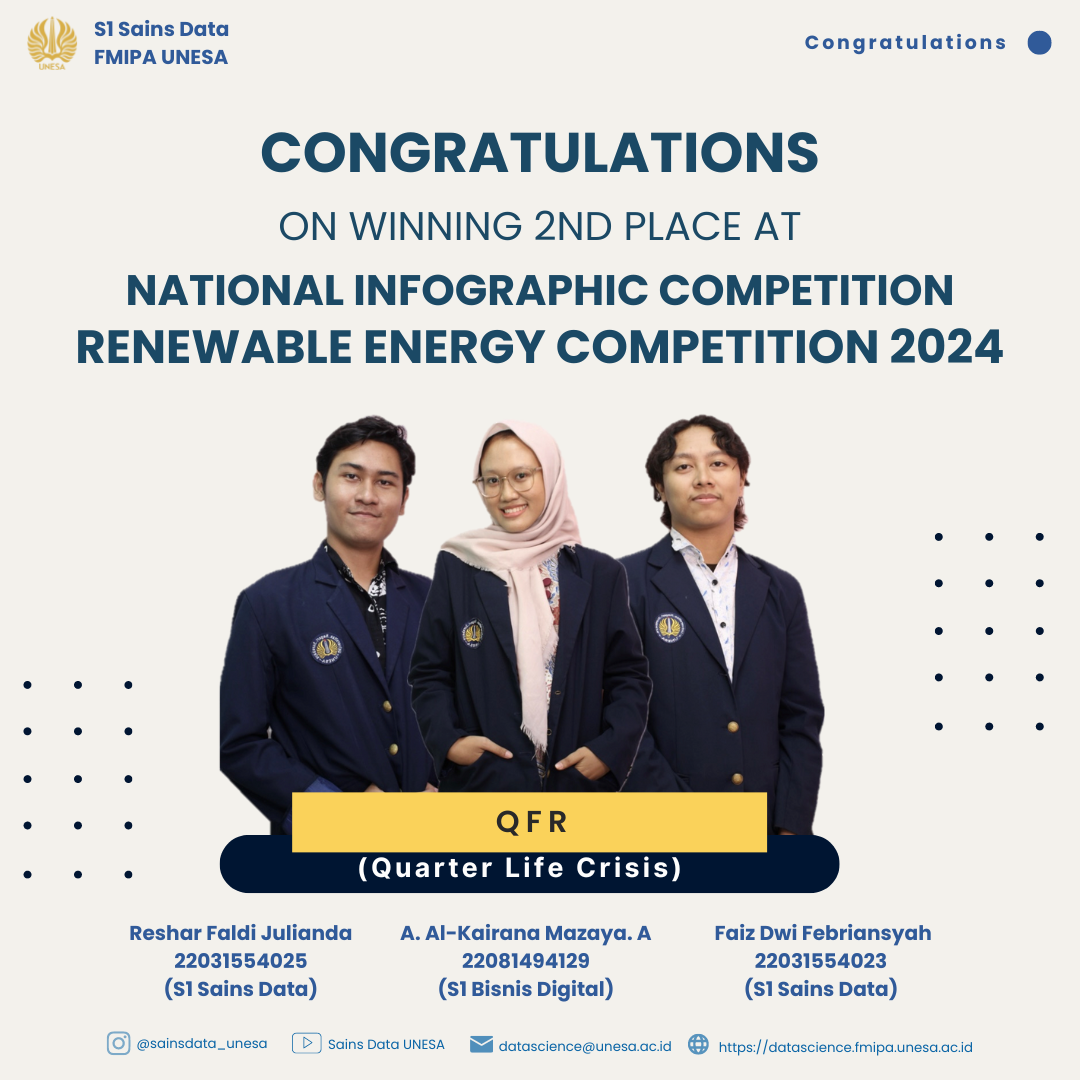 Lomba ini menekankan pada penerapan ilmu pengetahuan data untuk memecahkan masalah nyata dalam bidang energi terbarukan, terutama di bagian lingkungan yang dibentuk dalam bentuk infografis. Keberhasilan tim dalam kompetisi ini tidak hanya mengukuhkan dirinya sebagai mahasiswa berprestasi, tetapi juga membanggakan almamater, UNESA.